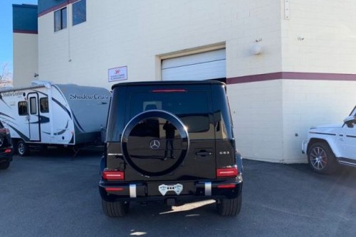G63前后轮拱采用了喇叭形设计,这令它看起来更具肌肉感,大尺寸轮毂设计为它增加了一定的运动气息,配备的大尺寸卡钳直观彰显其内部蕴含的充足动力内容。尾部后挂设计直观彰显其越野特质,矩形的尾灯造型与方正车身设计相呼应,点亮后的辨识度也是非常不错的。