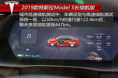 城市低速续航测试前同样将车辆充满电,满电续航里程显示同样为584km,车辆设定也与高速测试保持完全一致。在以30km/h时速行驶122.4km后,剩余表显续航里程447km,计算可得每行驶1km消耗的表显续航里程为1.12km,满电状态下Model S城市低速续航约为522km。
