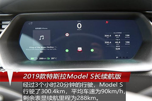 城际高速测试平均时速在90±2km/h,车辆行驶300km或者剩余电量15%时为止,然后再根据行驶里程和消耗续航里程的比例计算实际续航里程。经过3个小时20分钟的行驶,Model S行驶了300.4km,平均车速为90km/h,剩余表显续航里程为288km,计算得出在全程开启冷风空调23°C的情况下,该车城际高速续航能力为593km。