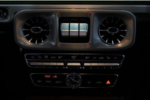 接下来我们看它的内饰部分。虽然它的外形硬朗,但是它的内部空间是非常豪华的。真皮的多功能方向盘带有电动调节功能,而仪表盘,则是和中控屏结合在一起,形成一种经典的联屏设计,看上去科技感十足,再看它的空调出风口,采用的是涡轮的造型,非常的漂亮。中间则是奔驰越野的保障,也就是它经典的“三把锁”。