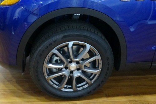 车身侧面,蓝色的云母漆格外耀眼,光度和色泽非常好,与大多数SUV造型不同,莱万特的车身造型更偏向轿跑车车身造型更加低趴的,但是车身线条十分流畅,前翼子板的家族三孔装饰,也非常精致,车窗饰条和门把手均为镀铬装饰,很有时尚感,底部,它选用了19寸的特殊轮毂,这个轮毂价值300美金,可见莱万特的地位之高。